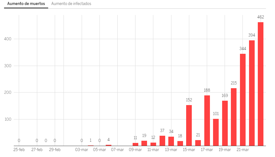 En las últimas 24 horas han muerto alrededor de 462 personas en el país ibérico, siendo el mayor incremento diario. Se habla de que la tendencia está muy cerca de lo visto en Italia.