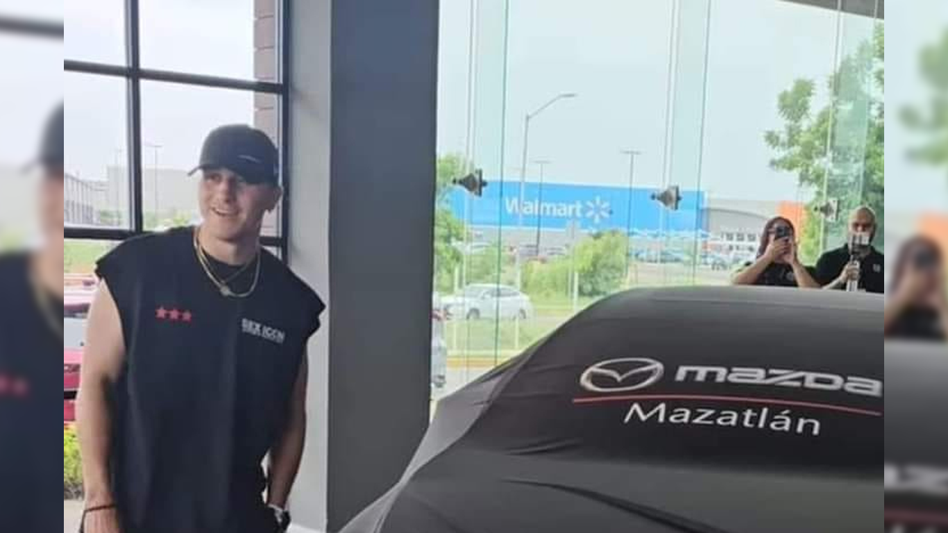En redes sociales se difundió el momento en que "El Green" acudió a una de las agencias de Mazda, acompañado de su madre, para recibir su nuevo automóvil, un modelo en color negro.