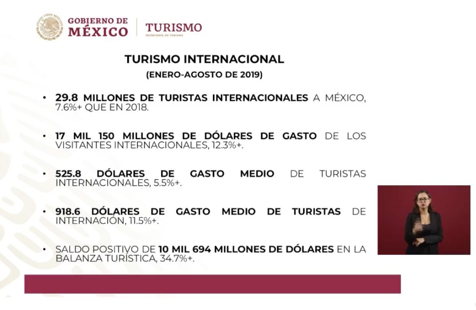 Torruco agregó que 29.8 millones de turistas internacionales han visitado el país en lo que va de 2019, habiendo un incremento del 7.6 % con respecto al año pasado, por lo que resulta de vital importancia el seguir buscando inversiones para este ámbito que deja una muy buena derrama económica.
