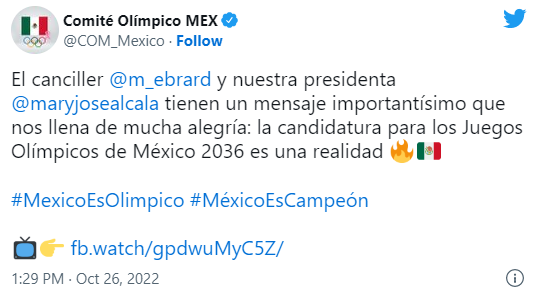El Comité Olímpico Mexicano (COM) ha compartido, a través de la cuenta de Twitter, que ha sido gracias al trabajo del canciller Marcelo Ebrard y a la presidente de éste, Mary José Alcalá, que México participará a la contienda por ser la sede de los Juegos Olímpicos del 2036.