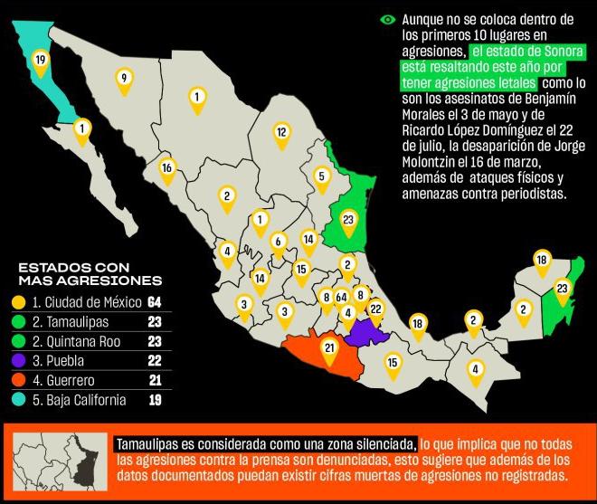 Los Estados que registraron mayor número de agresiones fueron: Ciudad de México con 64 agresiones, Tamaulipas y Quintana Roo con 23 cada uno, Puebla con 22, Guerrero con 21 y Baja California, con 19.
