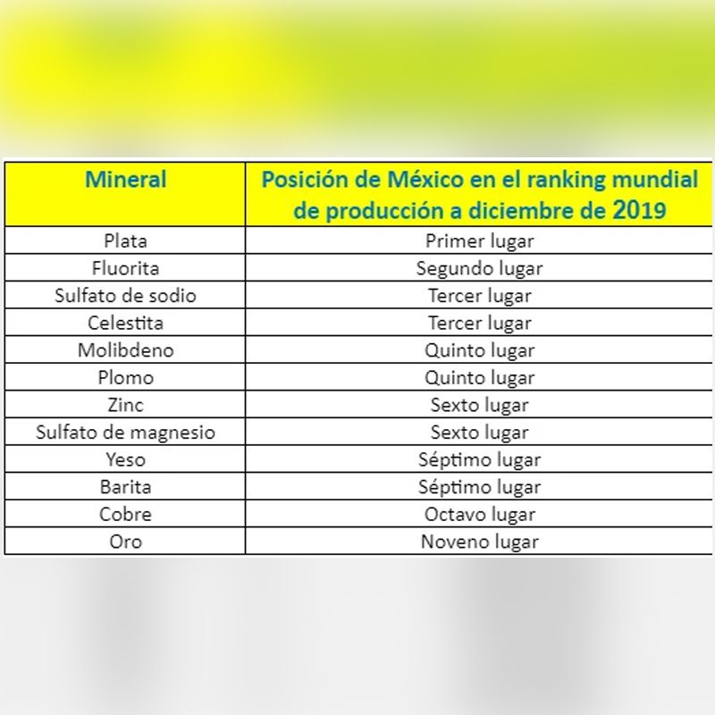 Según datos oficiales, la producción total de México de los minerales sumaron hasta diciembre de 2019, más de 12 mil millones de dólares, siendo los metales preciosos y no ferrosos los que representan el 86 % de la producción.
