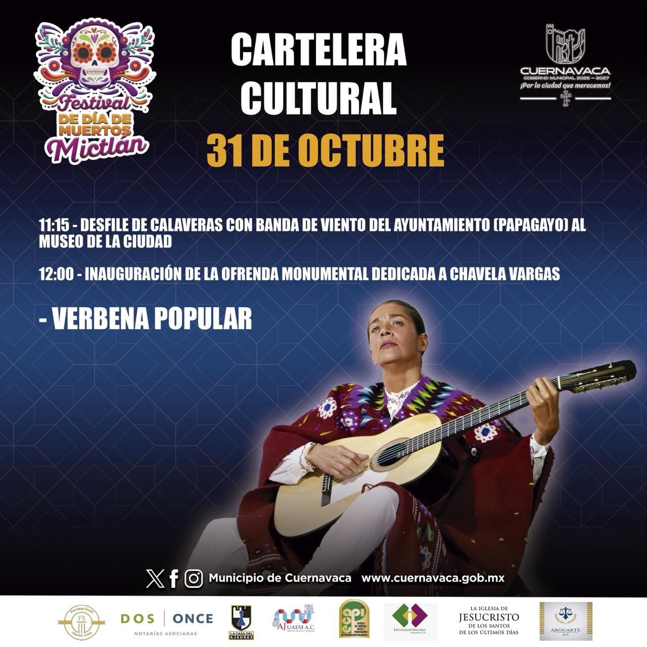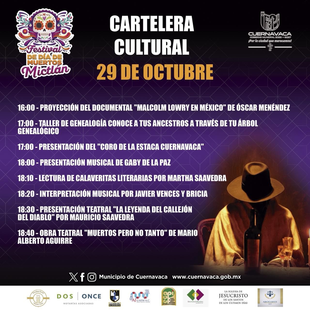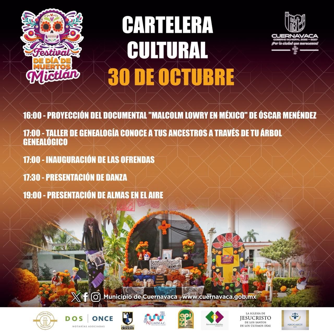 En el Museo de la Ciudad de Cuernavaca se realizarán proyecciones, talleres, presentaciones musicales, lecturas de calaveritas y obras de teatro, mientras que el 31 de octubre habrá una edición especial del “Mercadito Incluyente” donde emprendedores de grupos vulnerables ofrecerán productos con temática de temporada.
