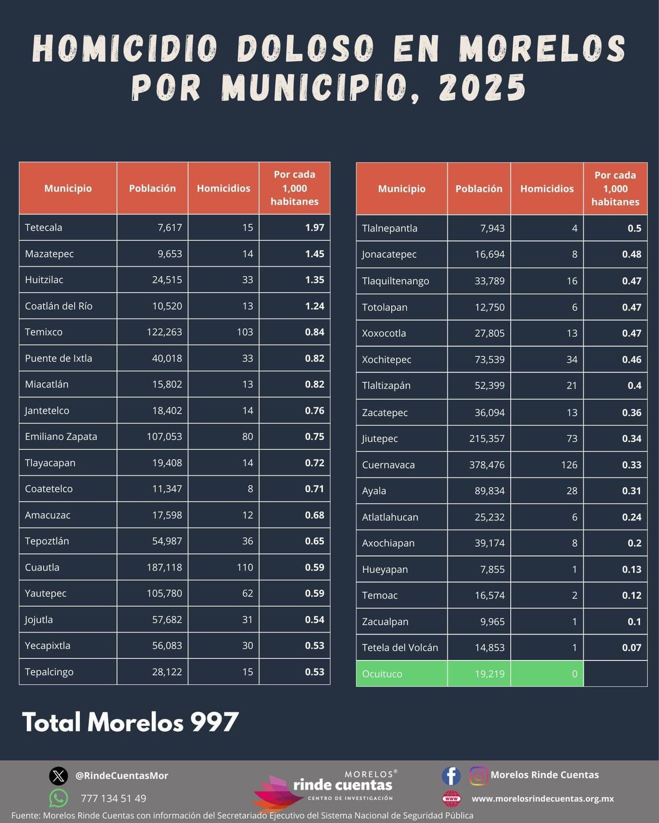Al analizar la tasa por cada cien mil habitantes, los municipios con mayor incidencia fueron Tetecala, con 197 homicidios por cada 100 mil habitantes; Mazatepec, con 145; Huitzilac, con 135; Coatlán del Río, con 124; y Temixco, con 84 homicidios por cada 100 mil habitantes, colocándose entre los focos rojos en términos proporcionales.