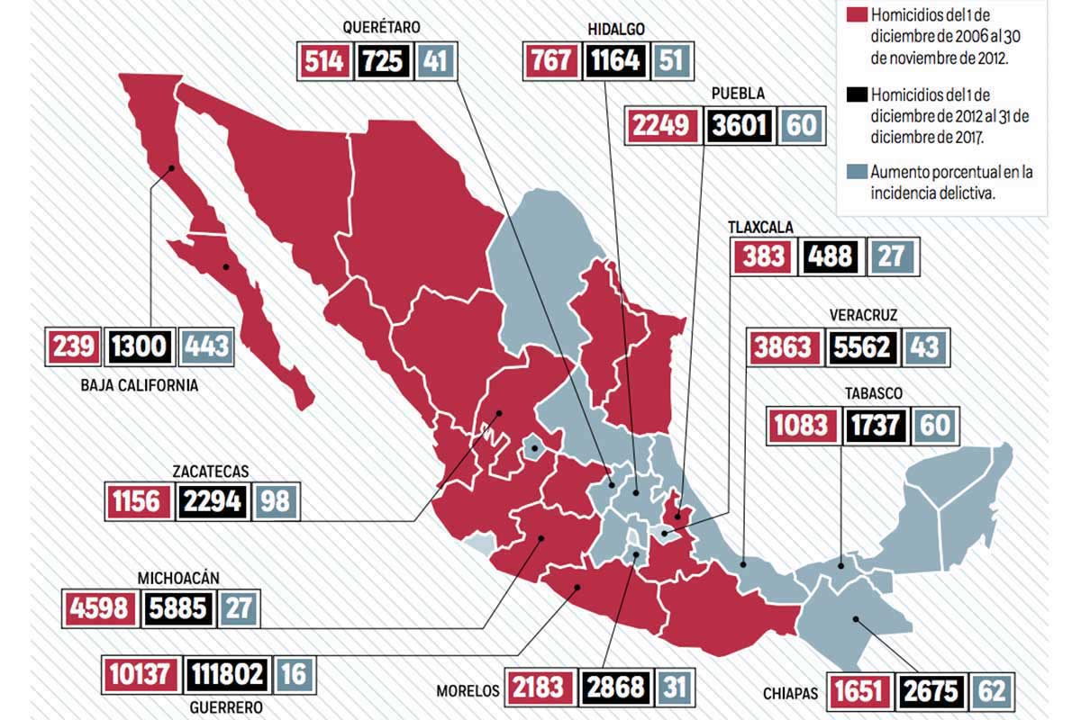 De acuerdo a la tabla comparativa sobre homicidios durante la administración del panista Felipe Calderón y la del actual presidente, Enrique Peña Nieto, en los últimos años han ido en aumento, superando al total de registrados en el periodo 2006 – 2012.El estado que presenta un mayor incremento es Baja California Sur, en el sexenio de Calderón se registraron 239, mientras que en lo que va del 2012 – 2017 suman mil 300, es decir, un repunte del 443.93 %. Morelos se encuentra entre los estados que han tenido un aumento en homicidios, para este sexenio incrementaron 31. 37 %, tan solo del 1 de diciembre de 2006 al 30 de noviembre de 2017 se tiene registro de 2 mil 183 homicidios, a poco de culminar la administración de Peña Nieto van 2 mil 868.
