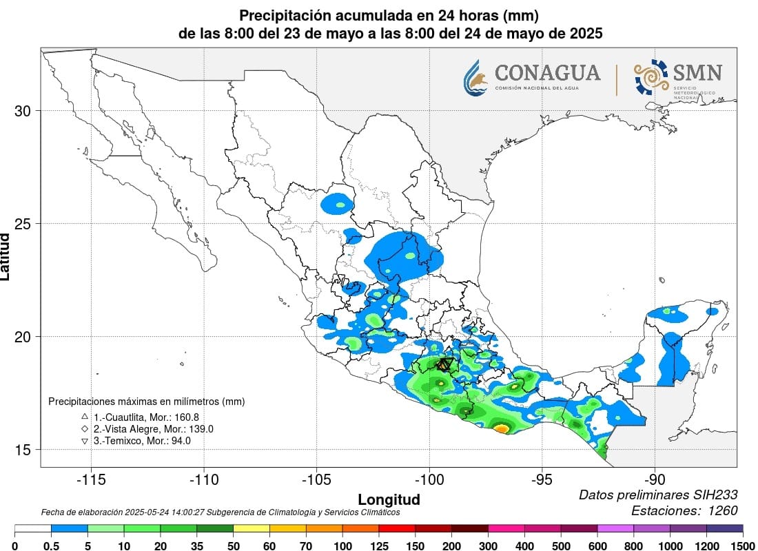 Para ponerlo en cifras, en las últimas 24 horas se reportaron hasta 160.8 mm, 139.0 mm y 94.0 mm de lluvia por metro cuadrado, respectivamente, en estos municipios, de acuerdo con el monitoreo de precipitaciones acumuladas entre las 8:00 a.m. del viernes y la misma hora del sábado.