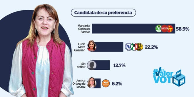 De acuerdo a la última encuesta publicada por Reporte Índigo, Margarita González Saravia encabeza las preferencias electorales en Morelos para la gubernatura de dicho estado. Los números son muy contundentes, ya que González Saravia de Morena-Verde-PT, aventaja con 58.9 %, mientras que su más cercana competidora es Lucía Meza Guzmán con solo 22.2 %.