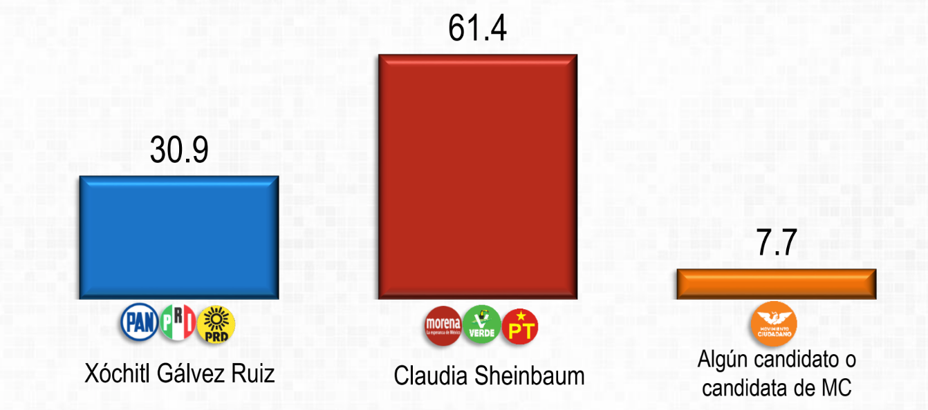 En lo que respecta a nivel nacional, la encuesta presentada por Mitofsky, pone a Sheinbaum con un 61.4 por ciento de preferencia, por solo 30.9 % de Xóchitl Gálvez. Aún esta encuesta no presenta ningún candidato de Movimiento Ciudadano, el cual se dará a conocer en próximos días.