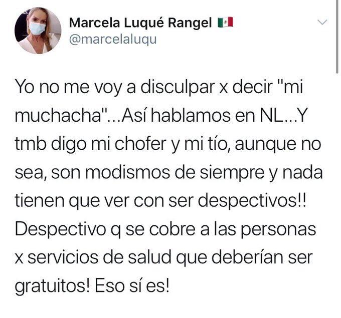 Pese a las severas criticas recibidas en redes sociales, la senadora suplente de Indira Kemplis respondió que: “No me voy a disculpar x decir “mi muchacha”…Así hablamos en NL…Y tmb digo mi chofer y mi tío, aunque no sea, son modismos de siempre y nada tiene que ver con ser despectivos!! Despectivo que se cobre a las personas x servicios de salud que deberíanser gratuitos! Eso sí es!”.