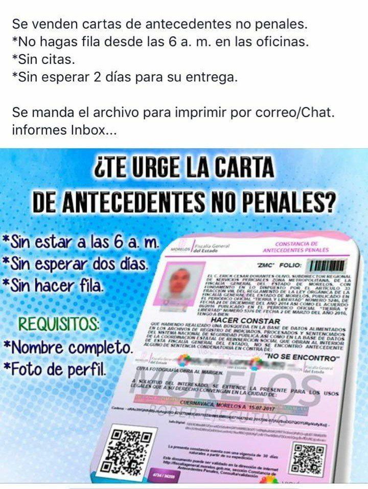 Lo anterior, debido a que a través de redes sociales personas ajenas a la Fiscalía y de manera personal ofrecen la Carta de Antecedentes No Penales, por lo que reiteran que este documento obtenido por otras vías es apócrifo y sin valor legal.