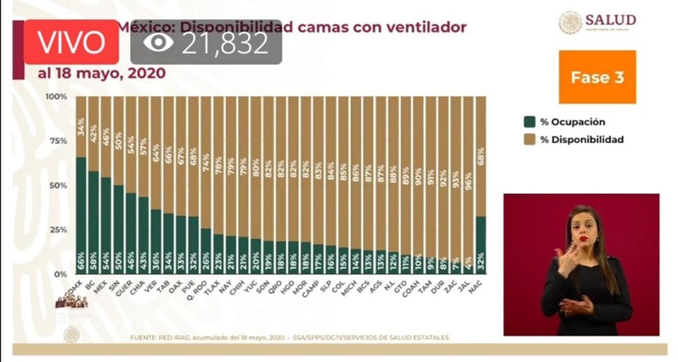 Por otra parte, las cifras de la Secretaría de Salud indican que durante la Fase 3 de la pandemia por Covid-19, en Morelos el 18 % de camas con ventilador son ocupadas por pacientes con diagnóstico de este virus.
