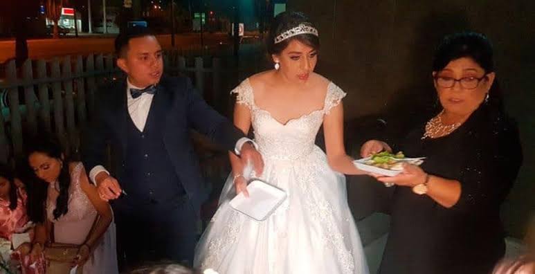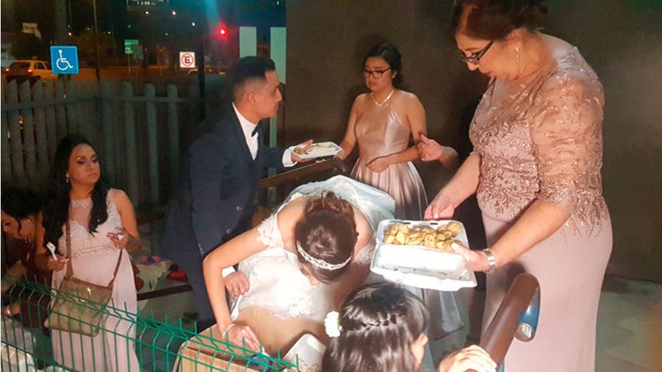 La peculiar historia le dio la vuelta a todo el país, pues los novios llegaron con su vestimenta de boda a las afueras de la sala de espera con varios contenedores de comida que repartieron con ayuda de sus invitados a la fiesta.