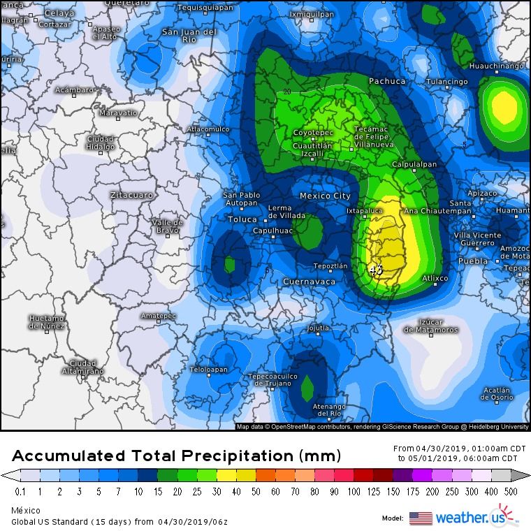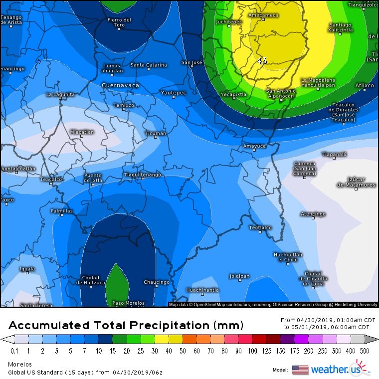 Estas lluvias y tormentas pueden hacerse presentes en varias partes de la entidad morelense, pero con mayor probabilidad e intensidad en los municipios del norte desde Huitzilac – Cuernavaca hasta Tetela del Volcán, así como en el sur, colindantes con Guerrero y Puebla, estimándose acumulados de 10-30 mm y puntuales de 50 mm.