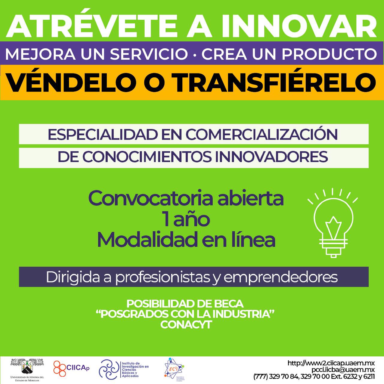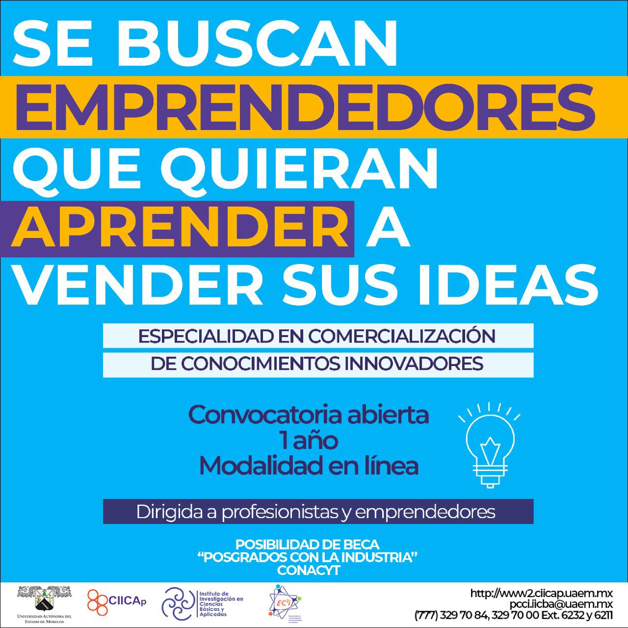 Si tienes muchas ideas en mente que no sabes cómo aterrizar y te gusta emprender, pero trabajas… a través de la Universidad Autónoma del Estado de Morelos (UAEM) podrás tomar la Especialidad en Comercialización de Conocimientos Innovadores que ofrece el Centro de Investigación en Ingeniería y Ciencias Aplicadas (CIICAp).
