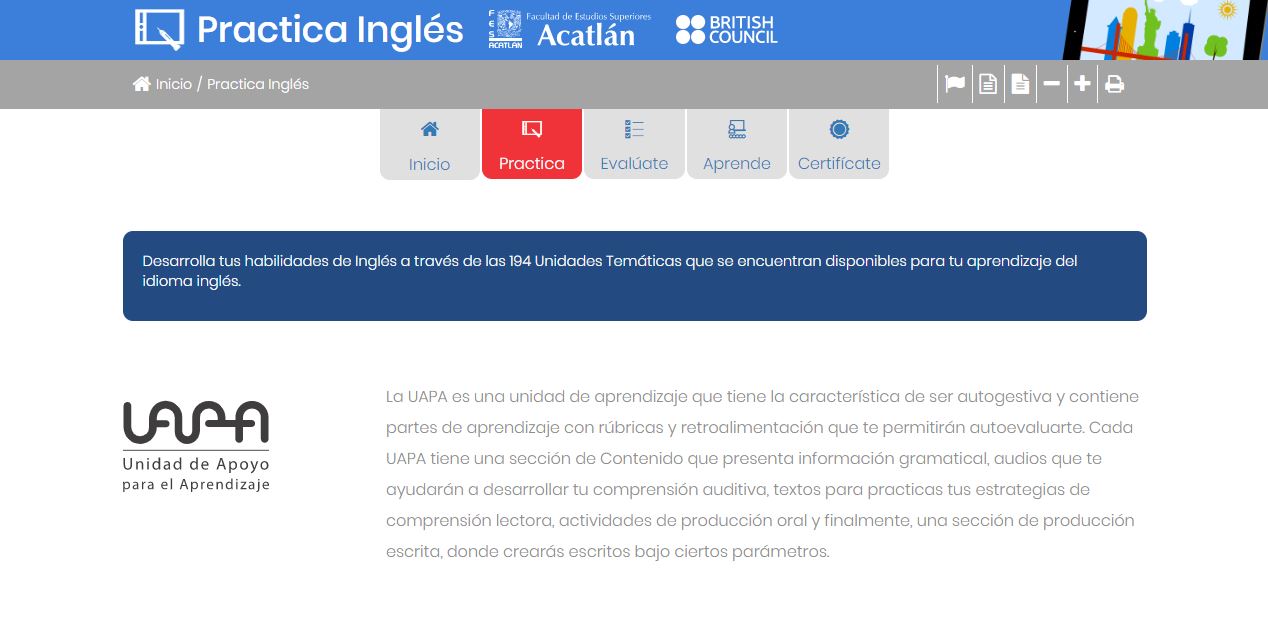 Es importante mencionar que las opciones de “Practica” y “Evalúate” son abiertas para todo público, mientras que “Aprende” y “Certifícate” son solo para alumnos de entidades participantes.