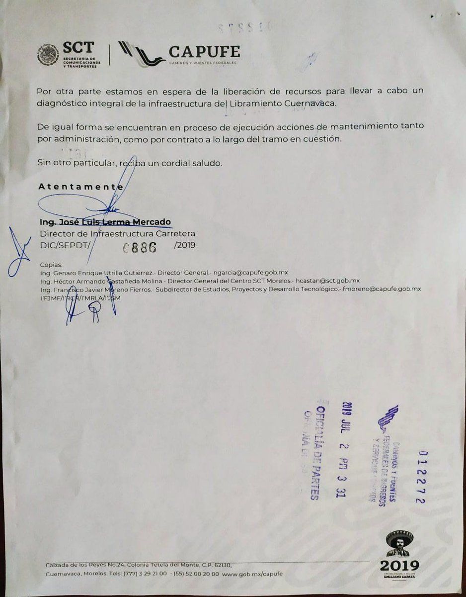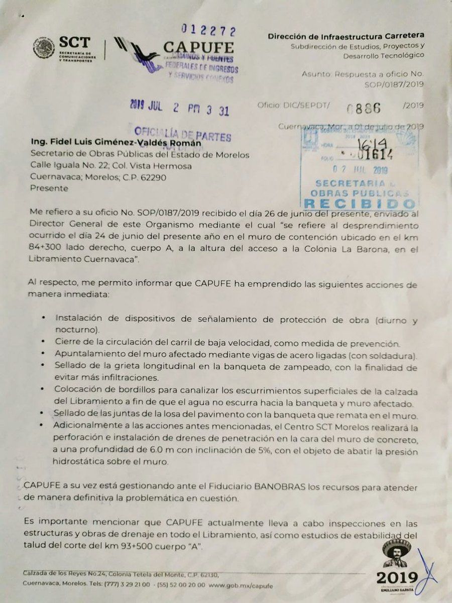 Sin embargo, por la tarde de ayer, el secretario de Obras Públicas de Morelos informó que Capufe dio respuesta al oficio que emitieron el pasado 25 de junio, en donde señalan las acciones que han emprendido tras la aparición de una grieta.