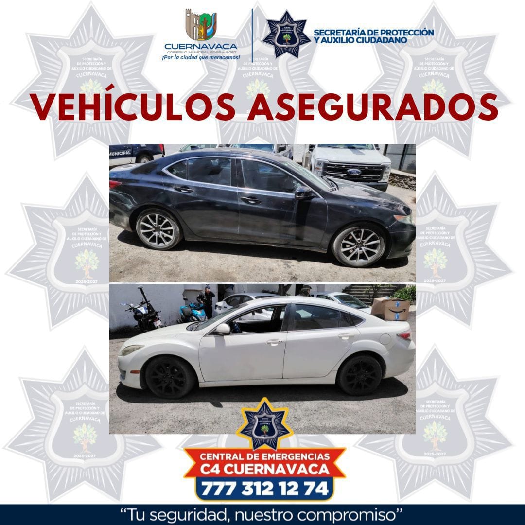 Los vehículos asegurados son un Acura XL, modelo 2015, color negro, y un Mazda 6 blanco, ambos con placas de Puebla. Todo lo incautado fue puesto a disposición de la autoridad correspondiente para las investigaciones.
