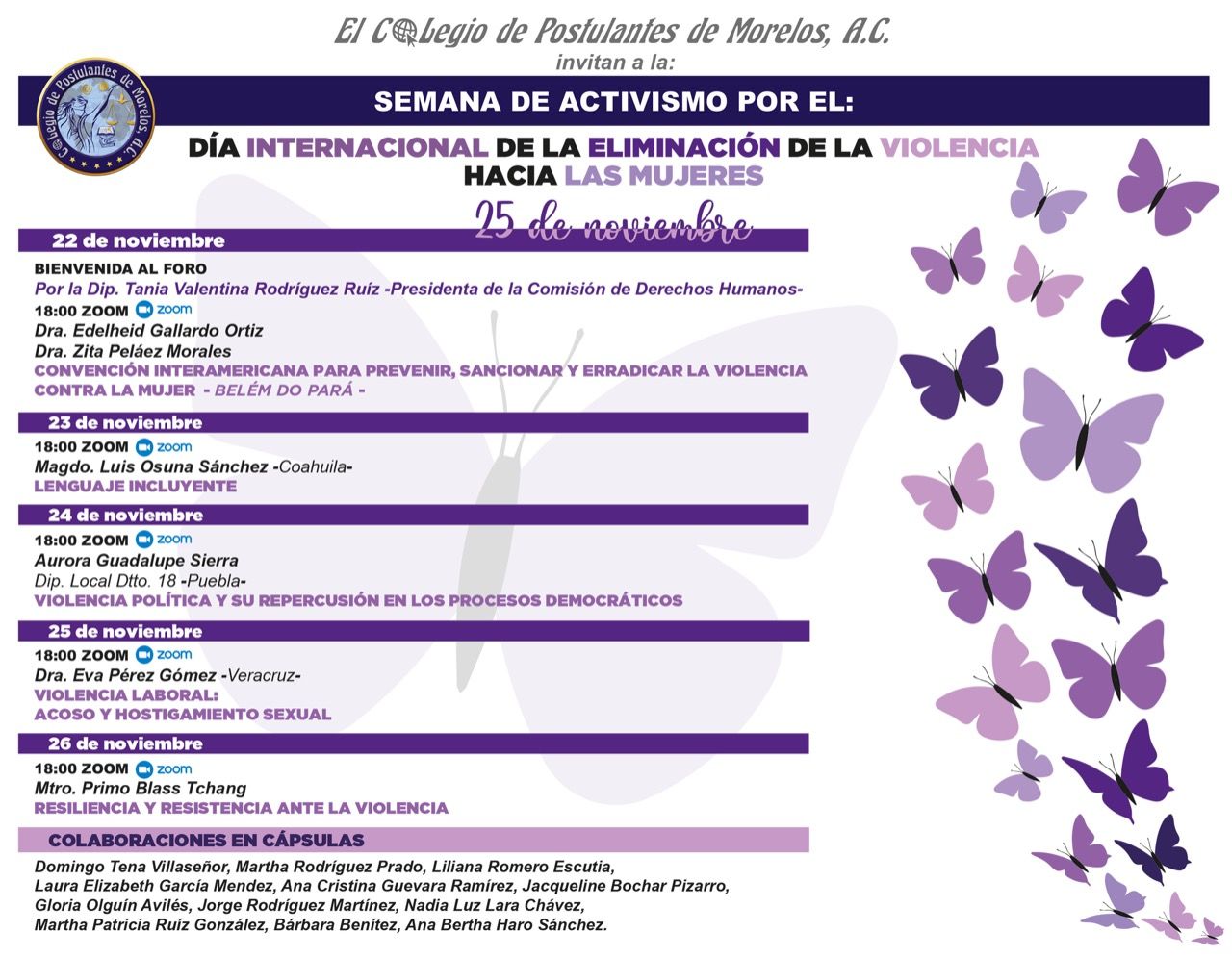 Normal Delgado, presidenta del Colegio de Postulantes de Morelos, informó que realizarán diversas conferencias con motivo del Día Internacional de la Eliminación de la Violencia hacia las Mujeres.
