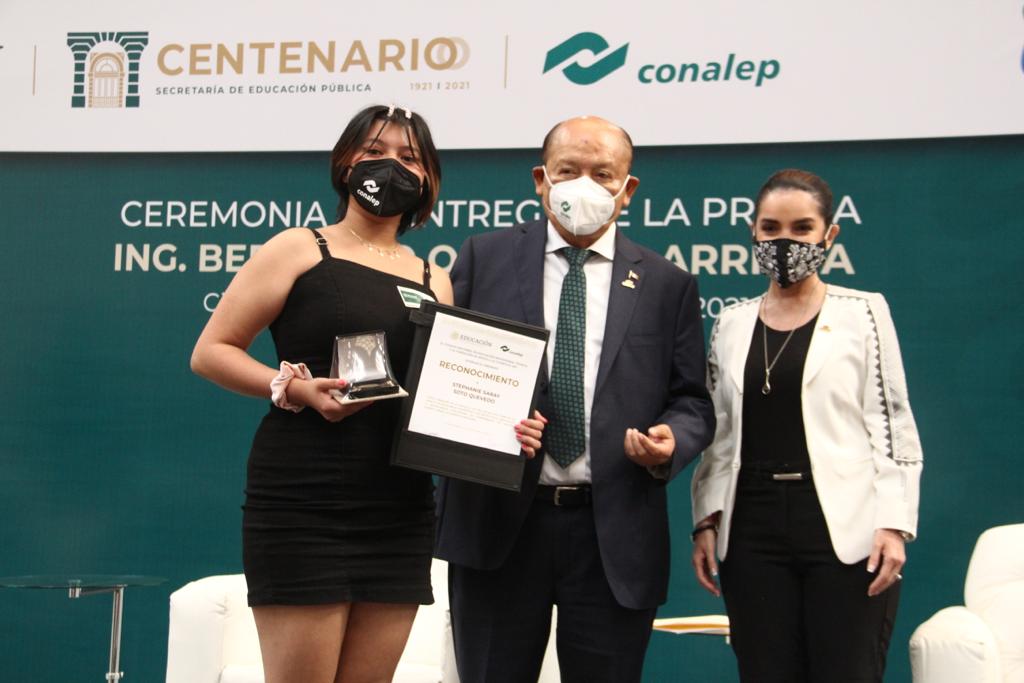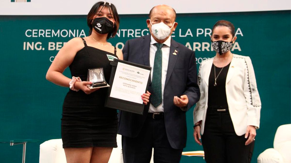 En reconocimiento a su destacada trayectoria escolar, la alumna Stephanie Saray Soto Quevedo, del Colegio de Educación Profesional Técnica del Estado de Morelos (Conalep Morelos), plantel Cuernavaca, recibió la Medalla ICA en la categoría de Excelencia Académica, en el marco de la Entrega de la Presea “Ing. Bernardo Quintana Arrioja” 2021.