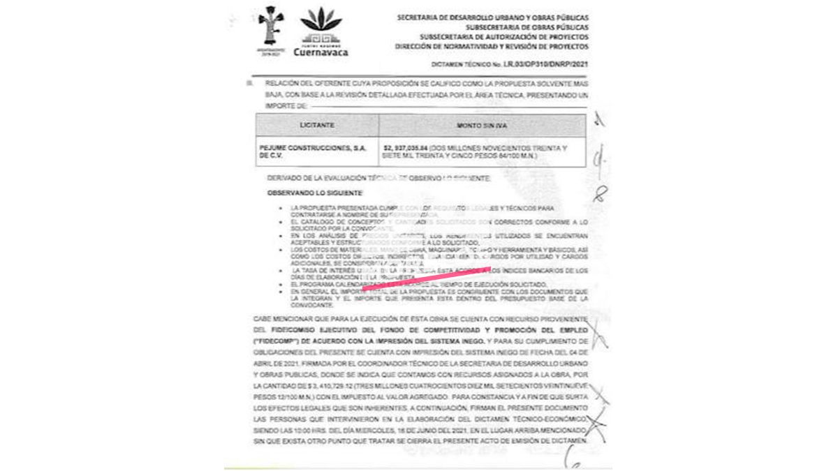 Por lo que el costo de la obra fue de dos millones 937 mil 53 pesos y fue otorgada a la empresa Pejume Construcciones S.A de C.V, según consta en el dictamen LR.03/OP310/DNRP/2021.