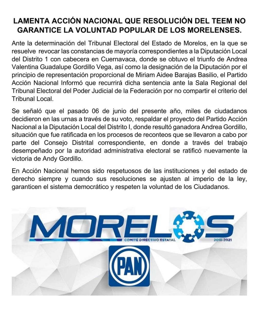 La dirigencia estatal del Partido Acción Nacional (PAN) en Morelos lamentó el resolutivo que dio el Tribunal Electoral del Estado de Morelos TEMM, en la que se resuelve revocar las constancias de mayoría correspondientes a la Diputación Local del Distrito 1 con cabecera en Cuernavaca, donde obtuvo el triunfo Andrea Gordillo, así como la designación de la Diputación Plurinominal de Miriam Barajas Basilio.