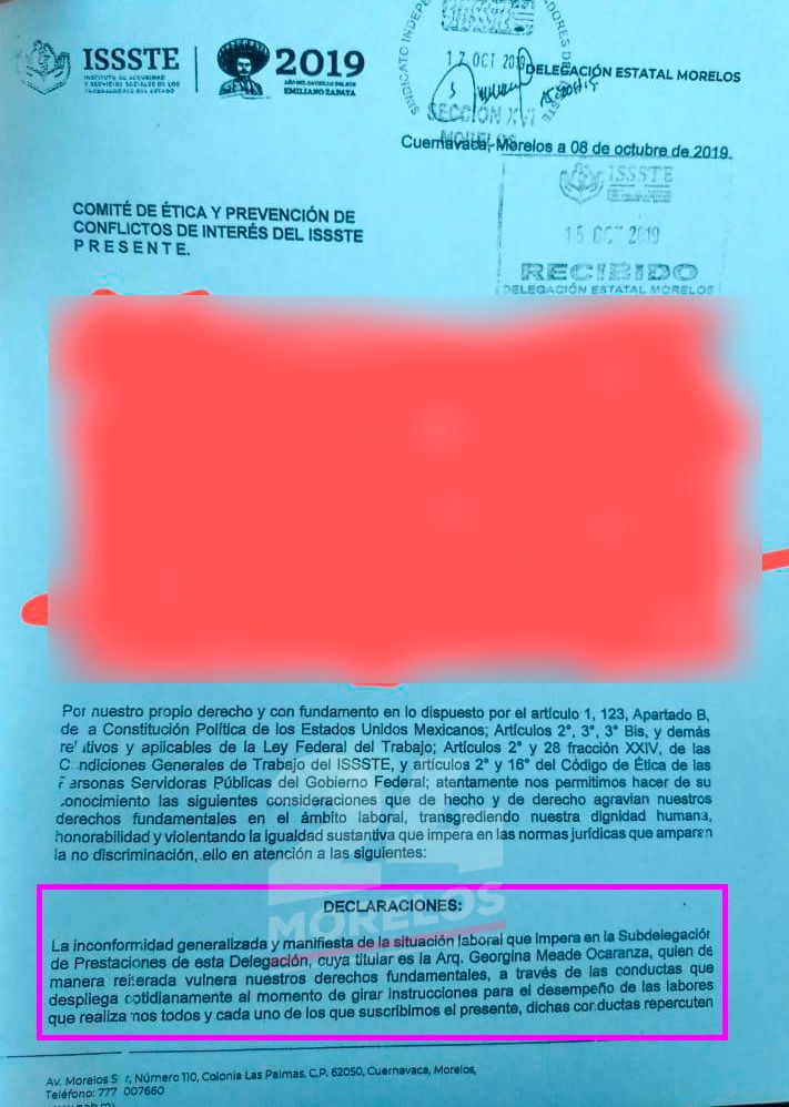 La orden, según refiere la testigo, provino de Georgina Meade Ocaranza, subdelegada de Prestaciones del ISSSTE, funcionaria que cuenta con varias denuncias por acoso laboral.