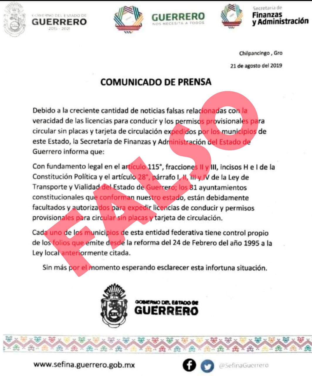 Asimismo, recientemente ha circulado otro comunicado supuestamente emitido por el Gobierno del Estado de Guerrero con fecha del 22 de agosto, en donde mencionan que los 81 Ayuntamientos que conforman el Estado, están facultados y autorizados para expedir permisos provisionales para circular sin placas y tarjeta de circulación, información que es totalmente falsa.