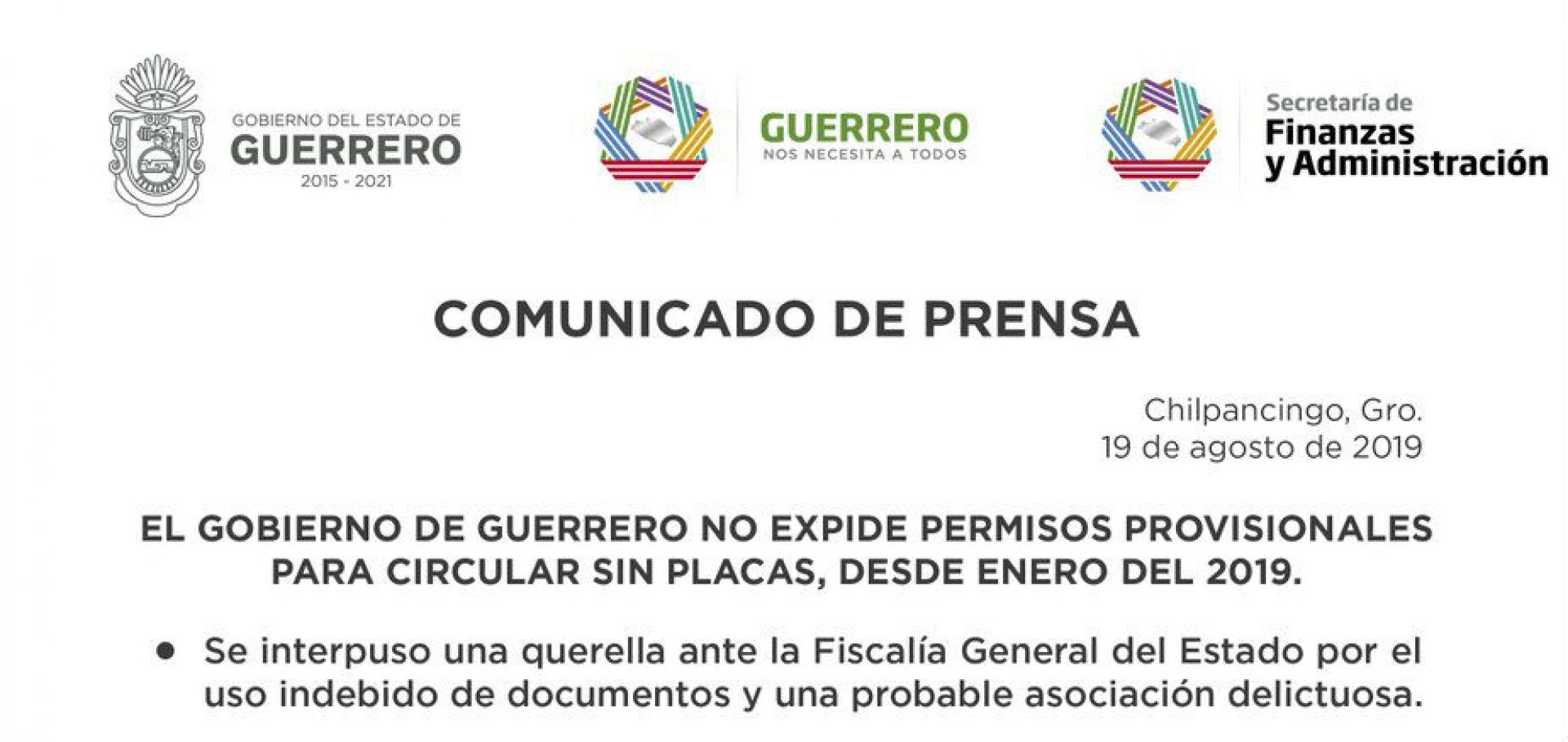 A través de un comunicado emitido por el Gobierno del Estado de Guerrero, dieron a conocer que desde el mes de enero de 2019 se dejó de expedir permisos provisionales para circular sin placas, por lo que los que se encuentran vigentes, dentro y fuera del estado, son apócrifos y falsos.
