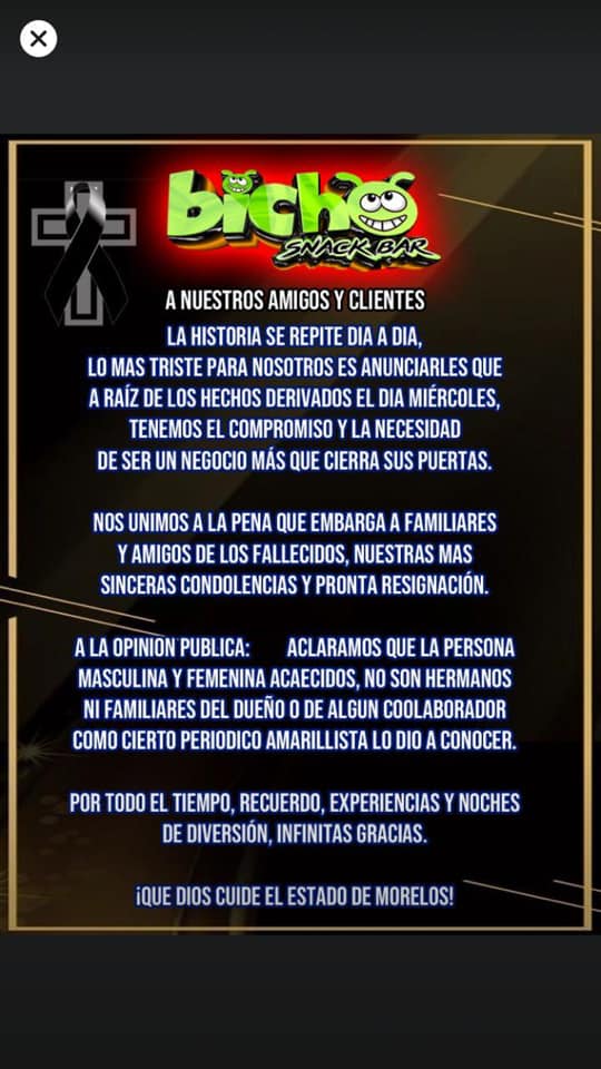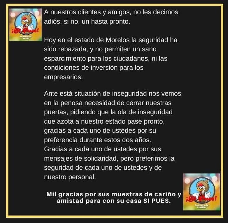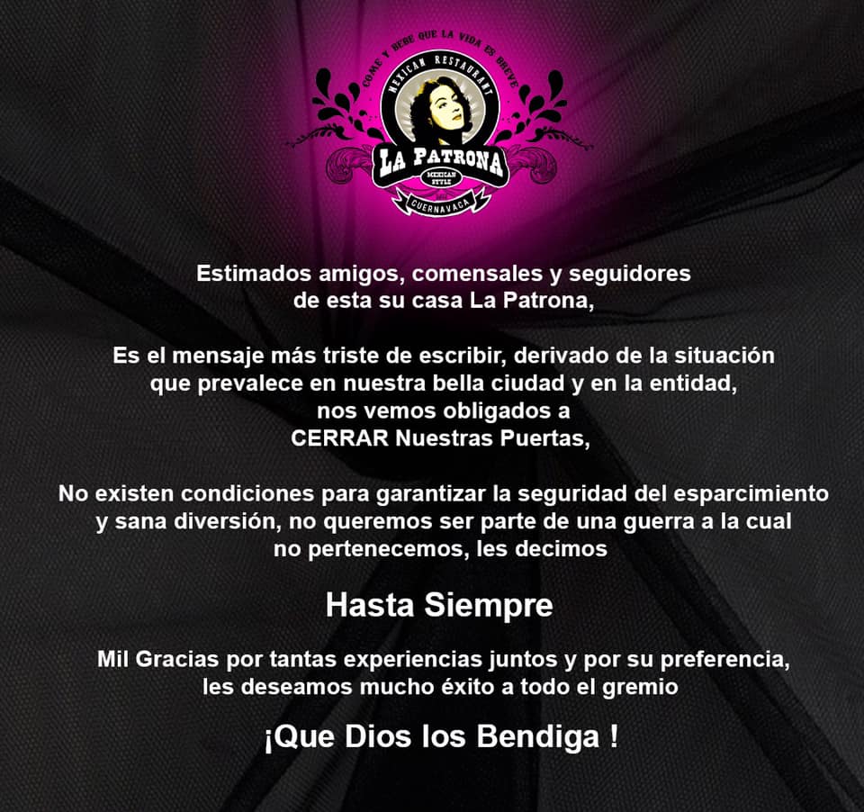 Refirió que si bien, ninguno de estos negocios estaban afiliados a la cámara empresarial que representa, sí se torna preocupante por la imagen que se da de la entidad morelense, lo que se traduce en una disminución de visitantes e incluso residentes que ya no acuden a los diferentes restaurantes, bares y centros nocturnos.