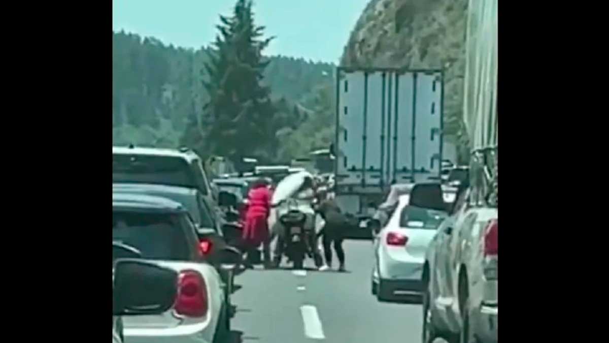 Al darse cuenta que los vehículos no avanzaban, esta mujer, quien se dirigía a la ceremonia de su boda, salió del auto que la transportaba para aceptar el “aventón” que un motociclista le ofreció para que llegara al altar. De esta manera, con un enorme vestido blanco, la novia se colocó a pie de carretera y se subió a la motocicleta negra conducida por un sujeto de casco blanco, quien sin ningún problema se puso en marcha para cumplir su misión.