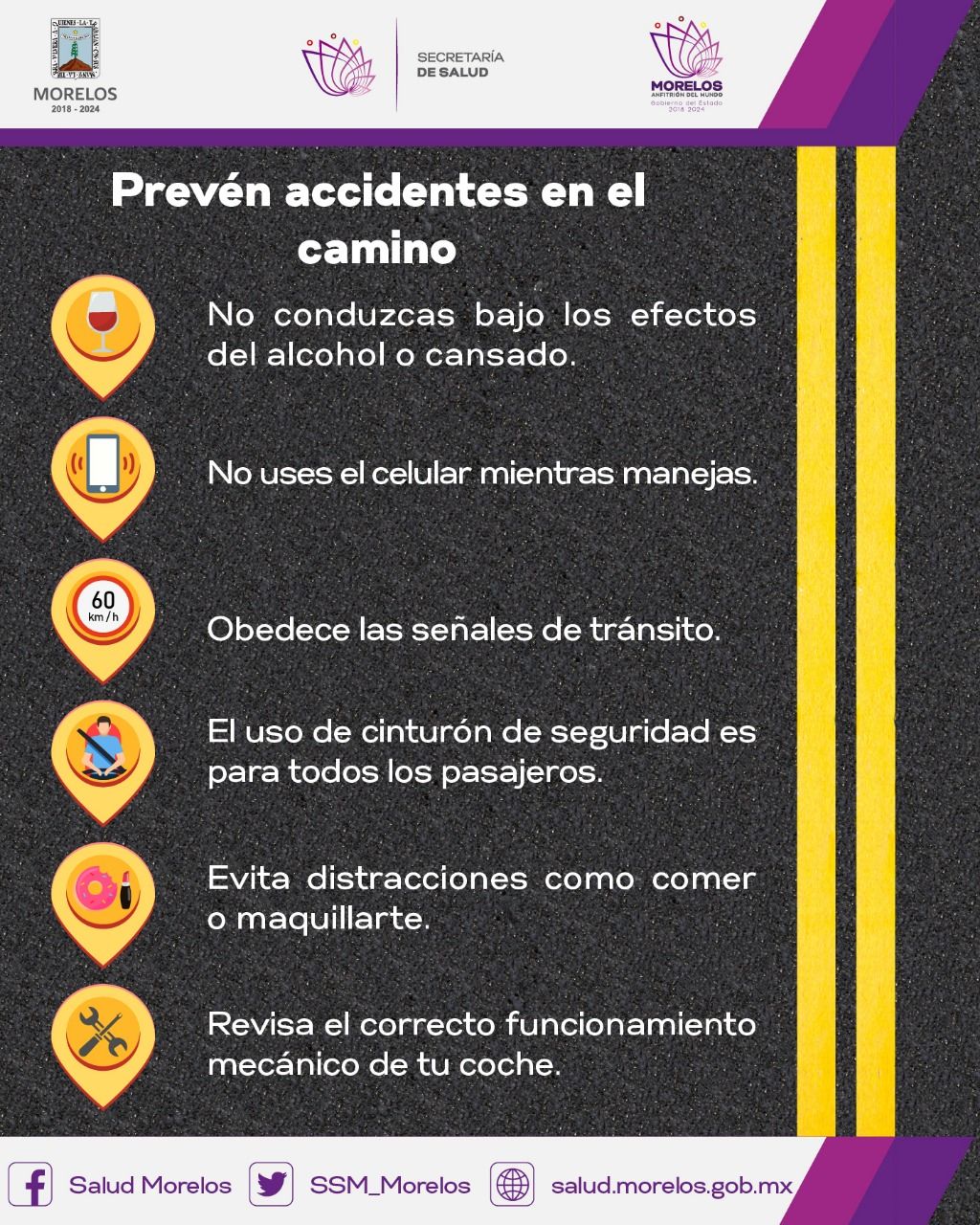 El funcionario detalló que de acuerdo al Informe sobre la Situación de la Seguridad Vial en Morelos, los accidentes automovilísticos han tenido un repunte en los últimos tres años, por lo que solicitó a la población a no conducir en malas condiciones, como bajo los influjos del alcohol o con sueño, usar siempre el cinturón de seguridad, respetar los límites de velocidad, señales de tránsito y semáforos.