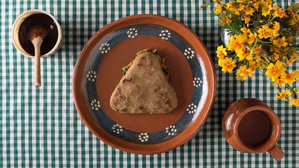 Un clásico cada vez que se visita el mercado de la Plaza Central en Tepoztlán. Son unos triángulos hechos de masa maíz, manteca y queso que van rellenos de un guisado.