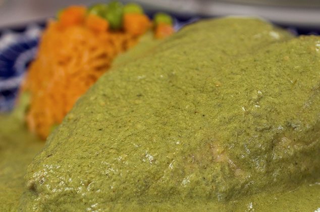 Un mole verde hecho a base de pepitas de calabaza seca y tostadas, molidas con hojas de aguacate, chile fresco, tomates, especias, ajo y cebolla.