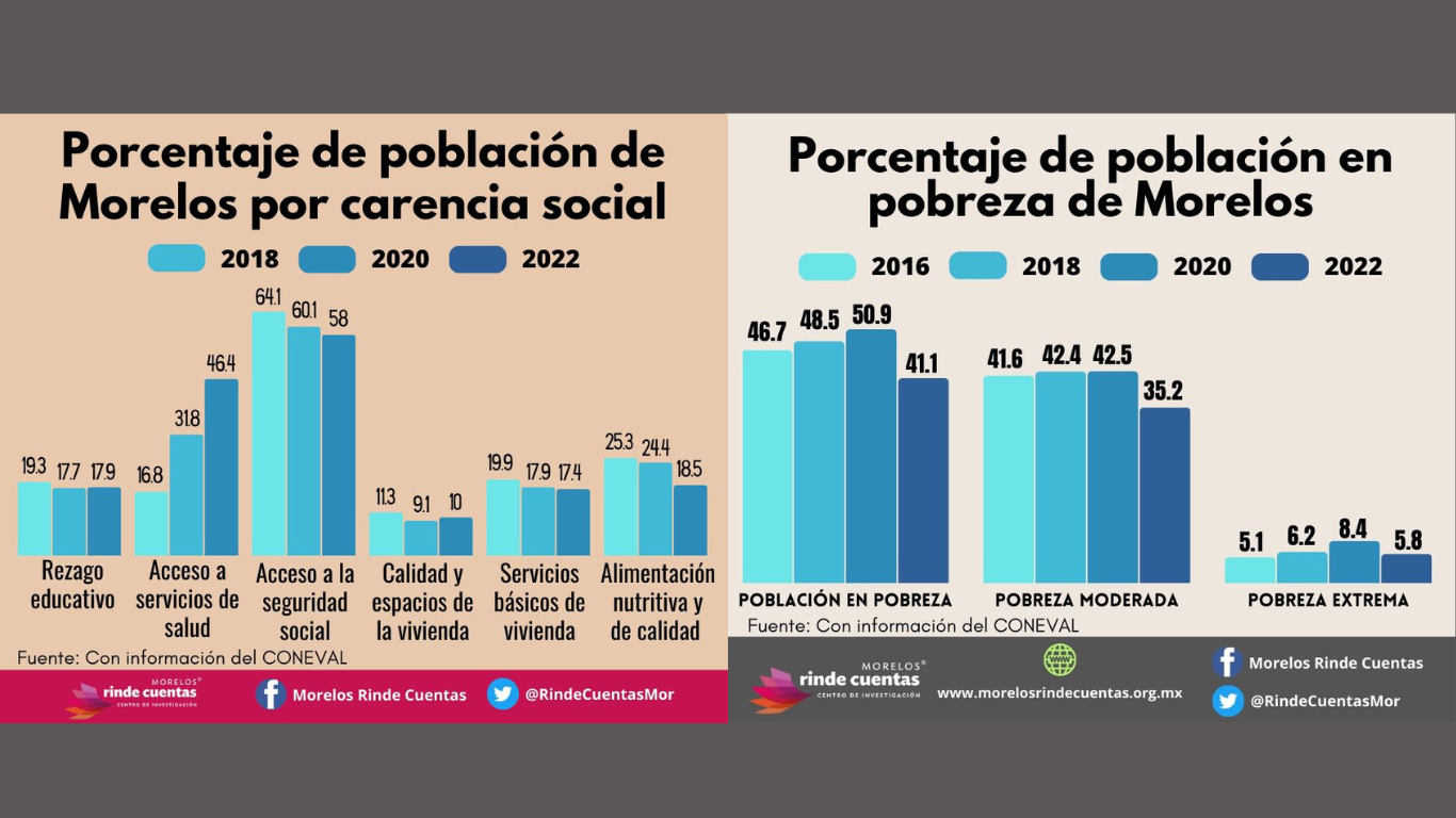 No sólo dieron a conocer datos de la pobreza en México, en un análisis más detallado a nivel estatal, revela que el estado de Morelos también ha experimentado una notable disminución en los niveles de pobreza. Datos presentados por la organización "Morelos Rinde Cuentas", basados en información proporcionada por CONEVAL, muestran una tendencia positiva desde 2016 hasta 2022.