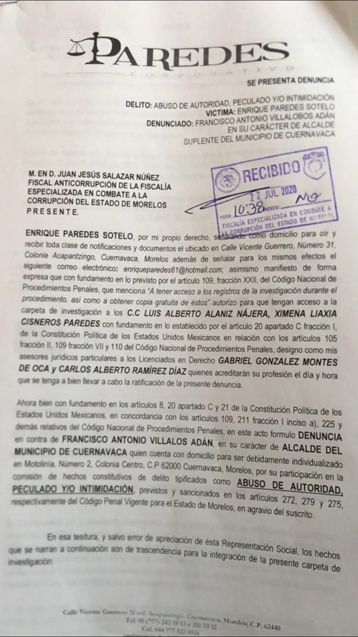 Las recientes declaraciones hechas por el alcalde de Cuernavaca, Antonio Villalobos Adán, en contra del presidente del Colegio de Abogados, Enrique Paredes Sotelo, a quien acusó de ser el autor de alterar la residencia del hoy gobernador, Cuauhtémoc Blanco, ha derivado en la presentación de una denuncia contra el presidente municipal por el delito de abuso de poder.