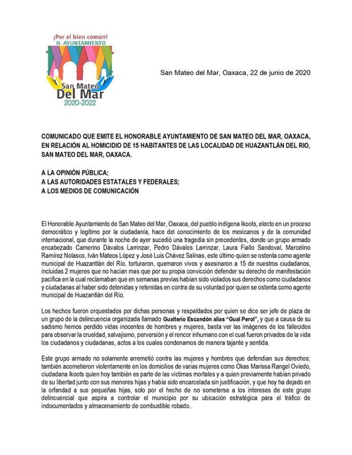 Ante los hechos violentos que se presentaron ayer en San Mateo del Mar, instruí a los titulares de la @SSP_GobOax y la @SEGEGO_GobOax para que brinden todo el apoyo a las familias de las víctimas y se garantice seguridad en las comunidades involucradas.