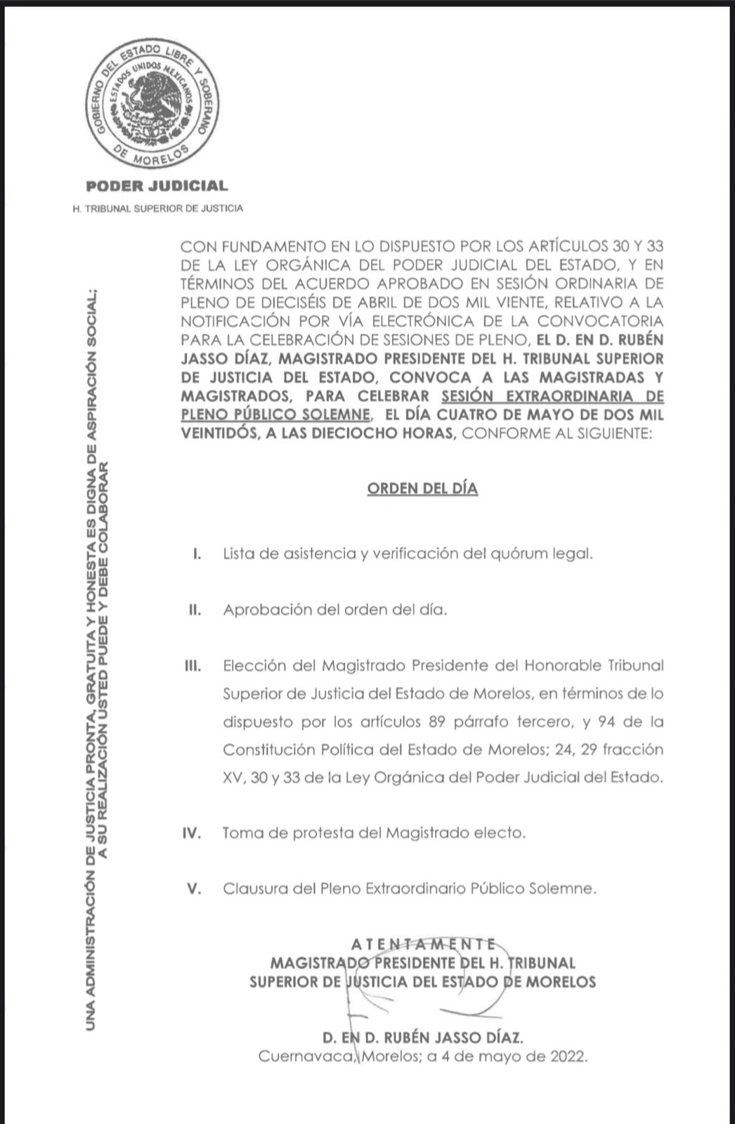 El presidente del Tribunal Superior de Justicia (TSJ) de Morelos, Rubén Jasso Díaz, va a concluir su encargo como presidente del Poder Judicial el próximo año, así que por esa razón ya no podría ser reelecto en el cargo de titular del TSJ.