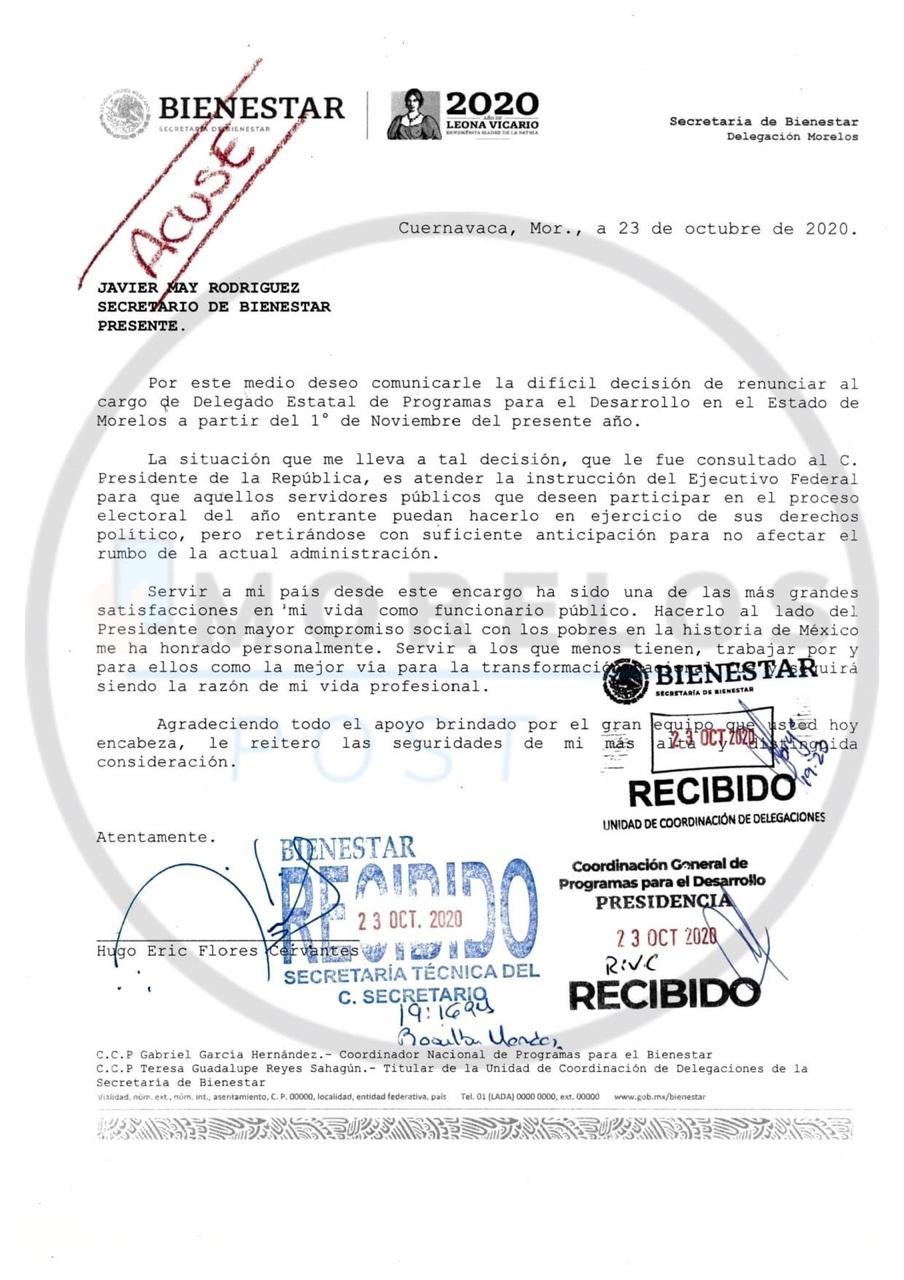 El delegado de programas para el desarrollo en Morelos de la Secretaría de Bienestar, Hugo Eric Flores Cervantes, presentó el pasado 23 de octubre su renuncia a dicho cargo.