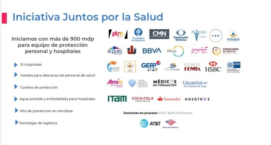 El presidente ejecutivo de Fundación Mexicana para la Salud (FUNSALUD) y miembro de esta iniciativa, Héctor Valle, agradeció de primera instancia la donación de 50 toneladas de alimento hecha por grupo Nestlé, e informó que ya casi se tienen listas 3 mil 500 camas para atender a pacientes con COVID-19.