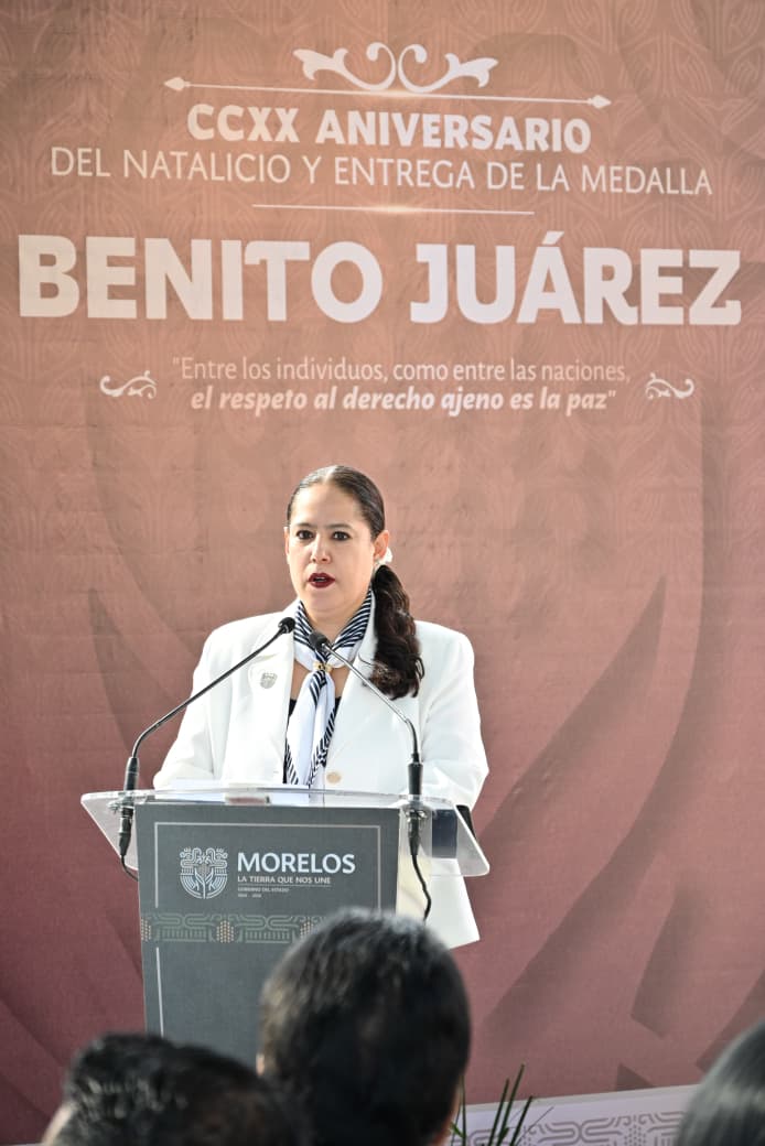 En el marco del CCXX aniversario del natalicio de Benito Juárez, la gobernadora de Morelos, Margarita González Saravia, afirmó que su administración se rige bajo los principios juaristas, enfocados en la rectitud, el combate a la corrupción y el uso responsable de los recursos públicos.