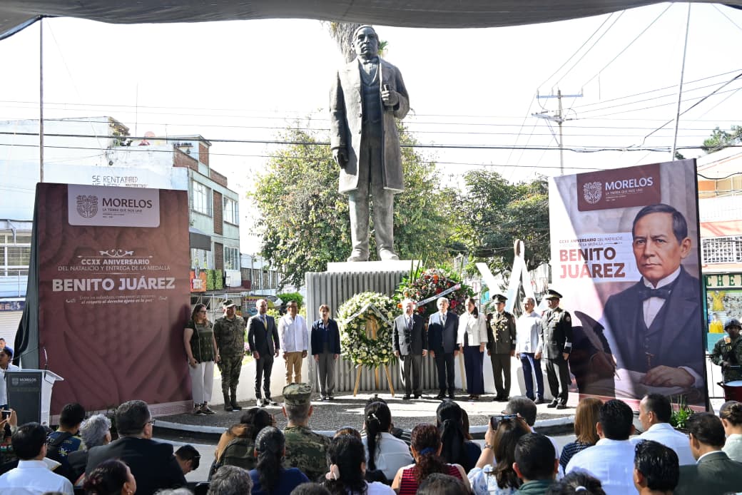 En el mismo acto, se llevó a cabo la entrega de la Medalla al Mérito Ciudadano “Benito Juárez”, así como el reconocimiento a las y los ganadores del Concurso Estatal de Pintura “Juárez Vive en Morelos”, en distintos niveles educativos.