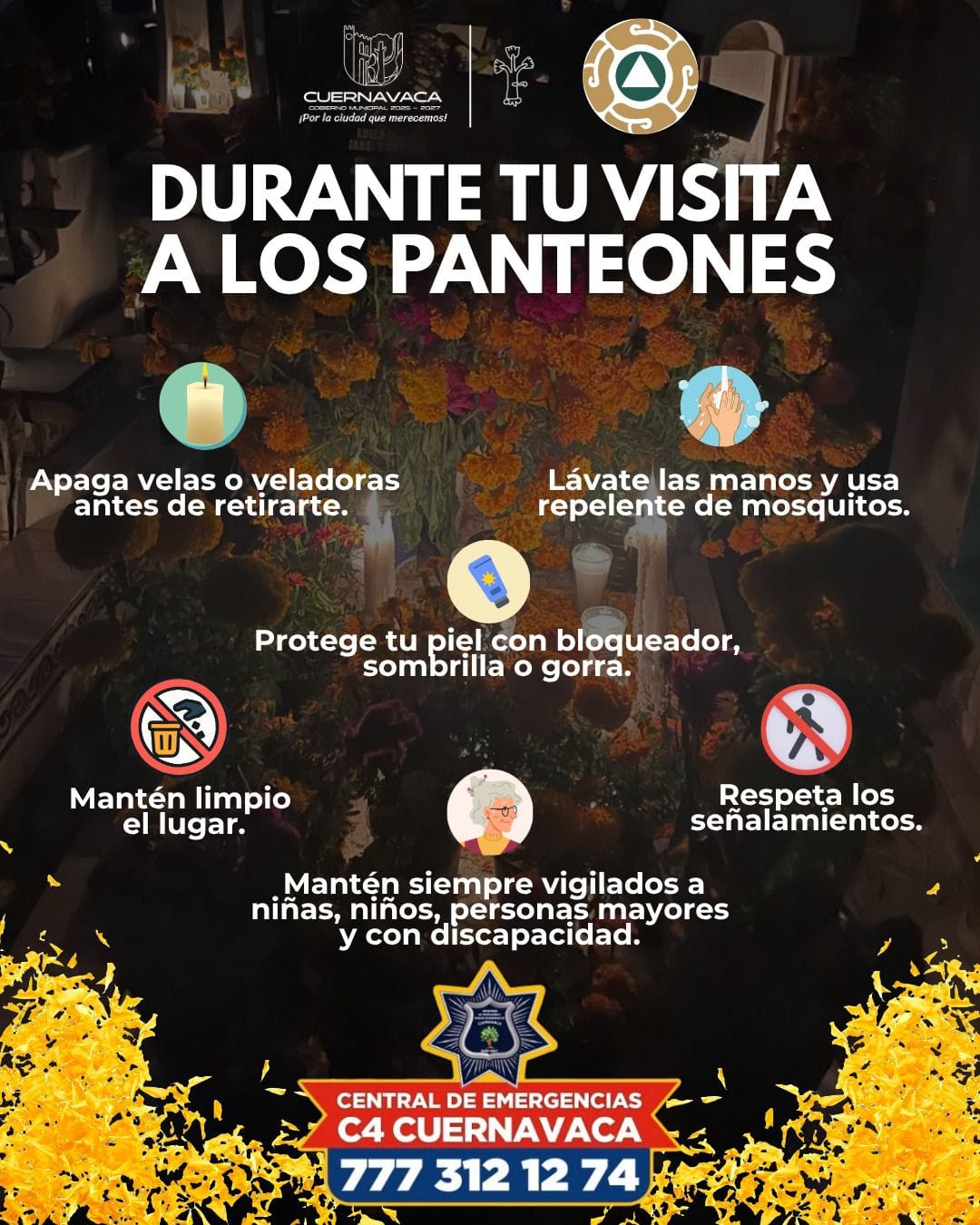 En el marco del Día de Muertos se espera una alta afluencia en diferentes panteones de la capital de Morelos. Ante esto, Protección Civil Cuernavaca, adscrita a la Secretaría de Protección y Auxilio Ciudadano (SEPRAC), han emitido una serie de recomendaciones preventivas para garantizar la seguridad y el bienestar de todas las familias durante su visita.