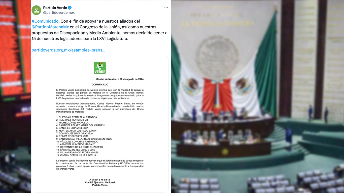 El Partido Verde Ecologista de México (PVEM) decidió transferir 15 de sus legisladores a la bancada de Morena, consolidando así la supremacía del Movimiento de Regeneración Nacional (Morena) en la Cámara de Diputados.