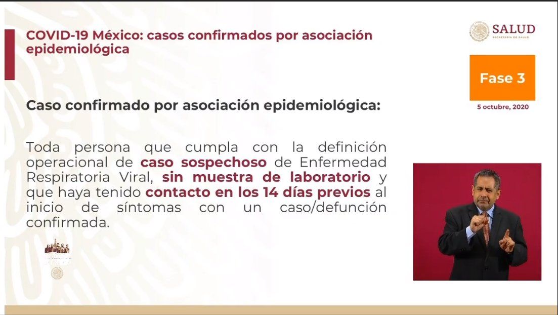 Contemplar casos confirmados por asociación epidemiológica, es decir, “toda aquella persona que cumpla con la definición operacional de caso sospechoso de Enfermedad Respiratoria Viral, sin muestra de laboratorio y que haya tenido contacto en los 14 días previos al inicio de síntomas con un caso/defunción confirmada”.
