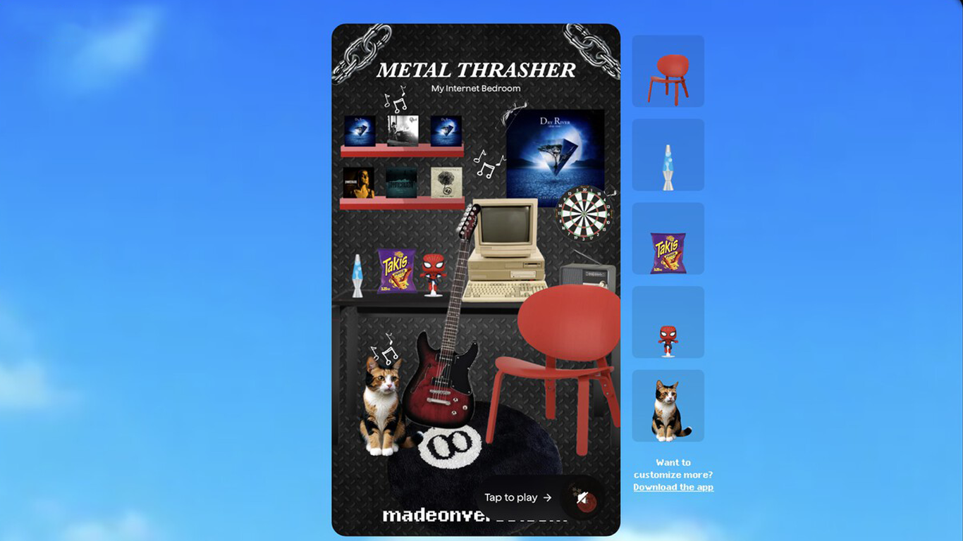 Los objetos y el estilo están inspirados en las canciones y épocas más escuchadas por el usuario, lo que da lugar a creaciones divertidas y, en ocasiones, caóticas que pueden ser compartidas con amigos.