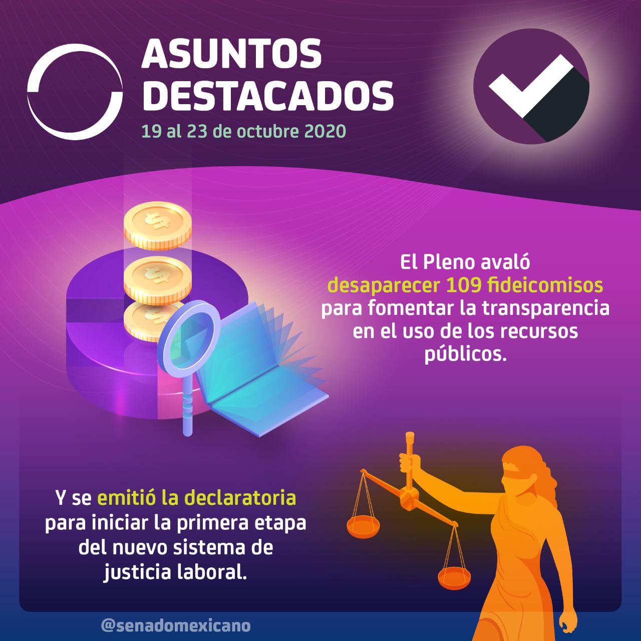 Entre los asuntos más destacados ocurridos en el Senado de la República durante la tercera semana de octubre, resalta que el Pleno avaló desaparecer 109 fideicomisos para fomentar la transparencia en el uso de recursos públicos.