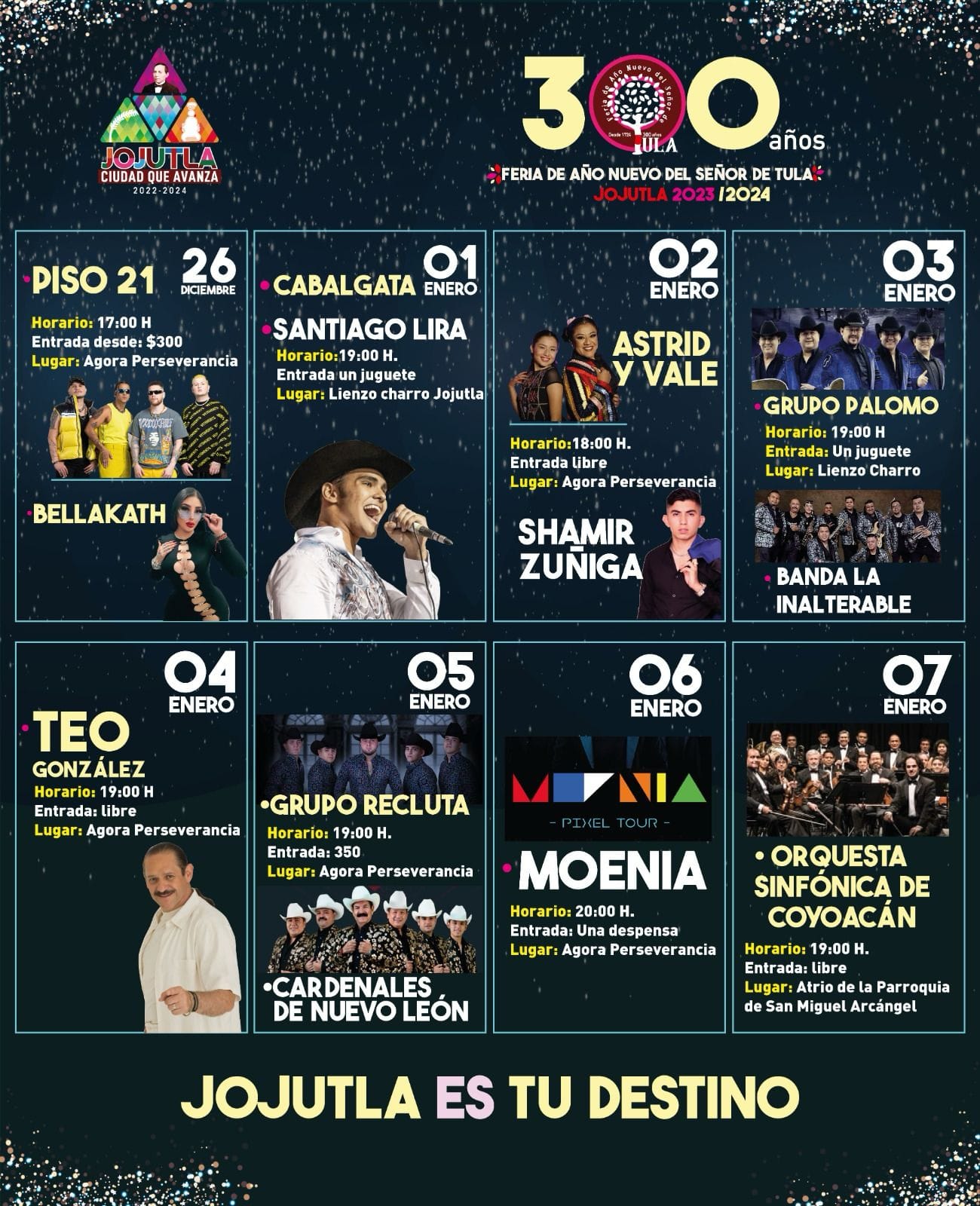 Hoy, 3 de enero, se presenta Grupo Palomo y Banda La Inalterable, en el Lienzo Charro a las 7 de la noche; mañana, jueves 4, llega Teo González con su comedia a la Ágora Perseverancia, a la misma hora; el viernes 5 de enero se presentará, en el mismo lugar, Grupo Recluta y los Cardenales de Nuevo León; el sábado 6 deleitará Moenia, en el mismo punto, a las 8 de la noche; y finalmente, el domingo 7 de enero, a las 7 de la noche, se presentará la Orquesta Sinfónica de Coyoacán, en el Atrio de la Parroquia de San Miguel Arcángel.