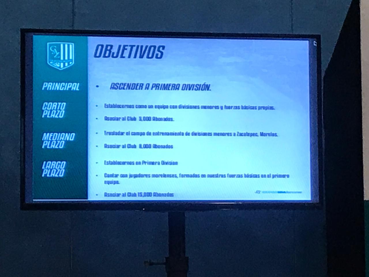 La mañana de este martes el gobernador de Morelos, Cuauhtémoc Blanco Bravo, Patricio Arana, presidente del Atlético Zacatepec, así como autoridades del deporte morelense, entre otras personalidades, presentaron el Proyecto Deportivo y Ejecutivo del Club Atlético Zacatepec para la temporada 2019 – 2020, donde uno de los objetivos será el ascender al equipo a la Liga Mx.