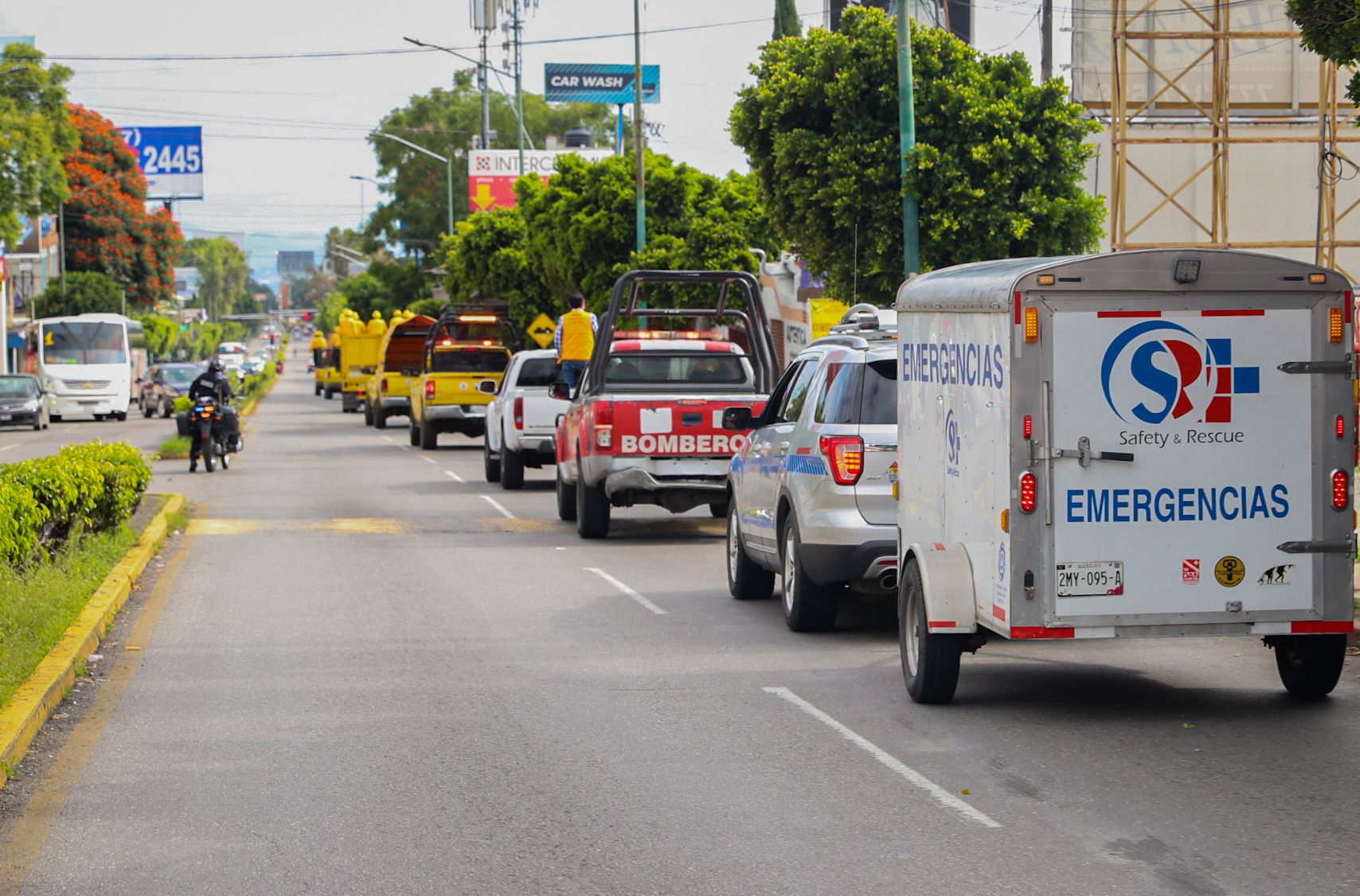 Cerca de 28 vehículos recorrieron las calles de Cuernavaca, desde la 24va Zona Militar hasta el Centro de la ciudad, con sus luces y sirenas encendidas en un acto conmemorativo a los sismos de 1985 y 2017.