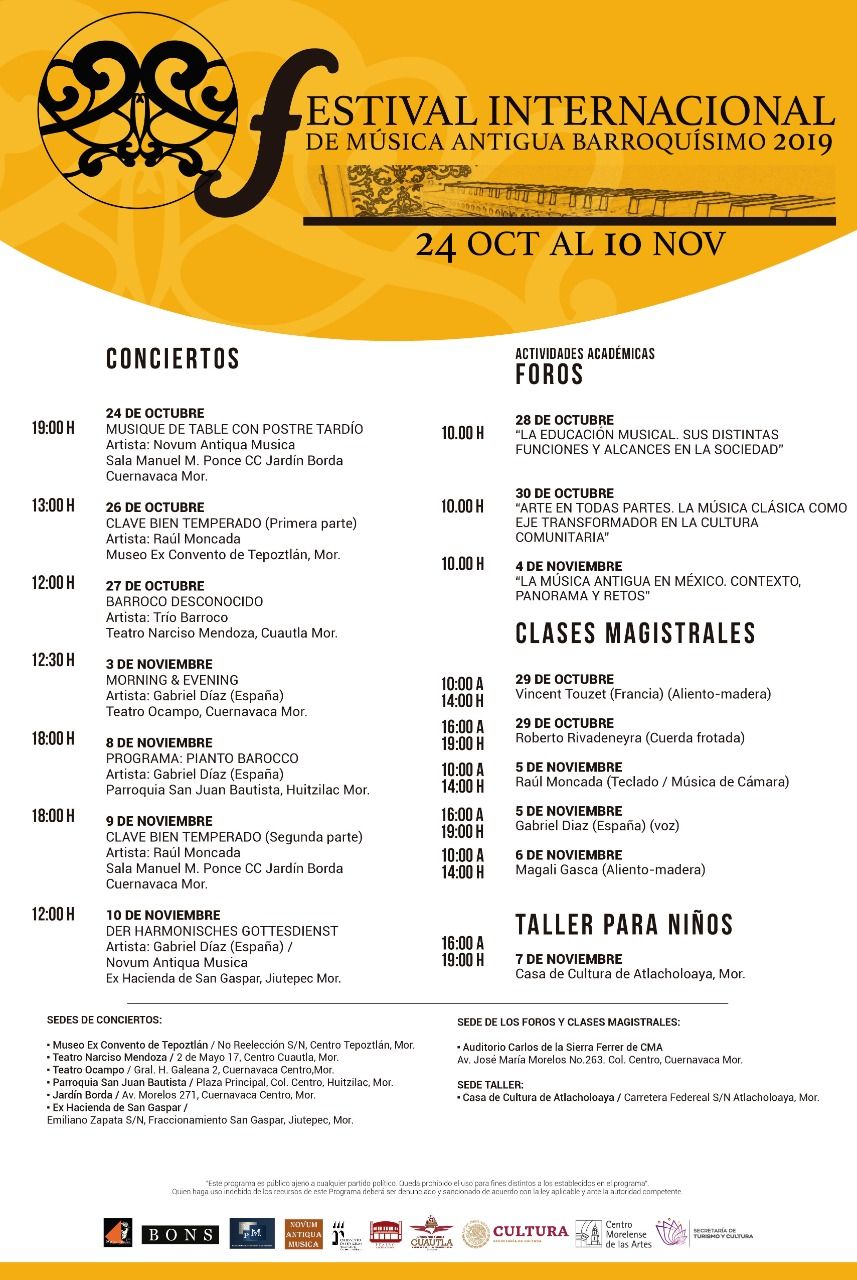 Del 24 de octubre al 10 de noviembre se llevarán a cabo siete conciertos, tres foros, varias clases magistrales y un taller para niños donde podrán aprender la importancia de la música; las sedes serán en los municipios de Cuernavaca, Cuautla, Huitzilac, Jiutepec y Xochitepec.